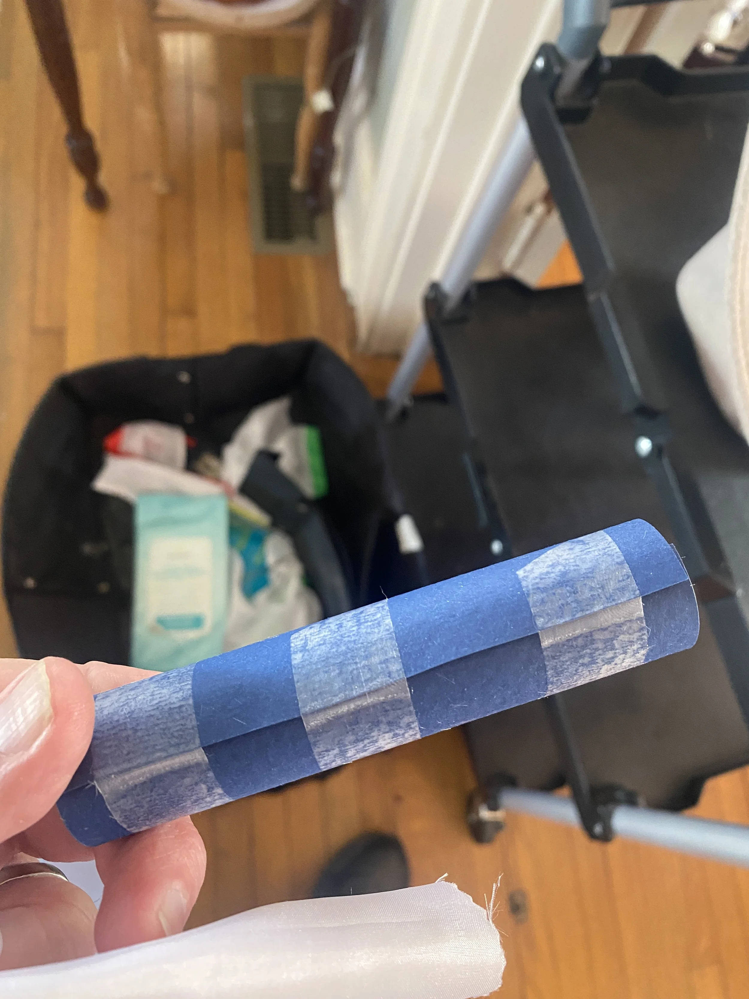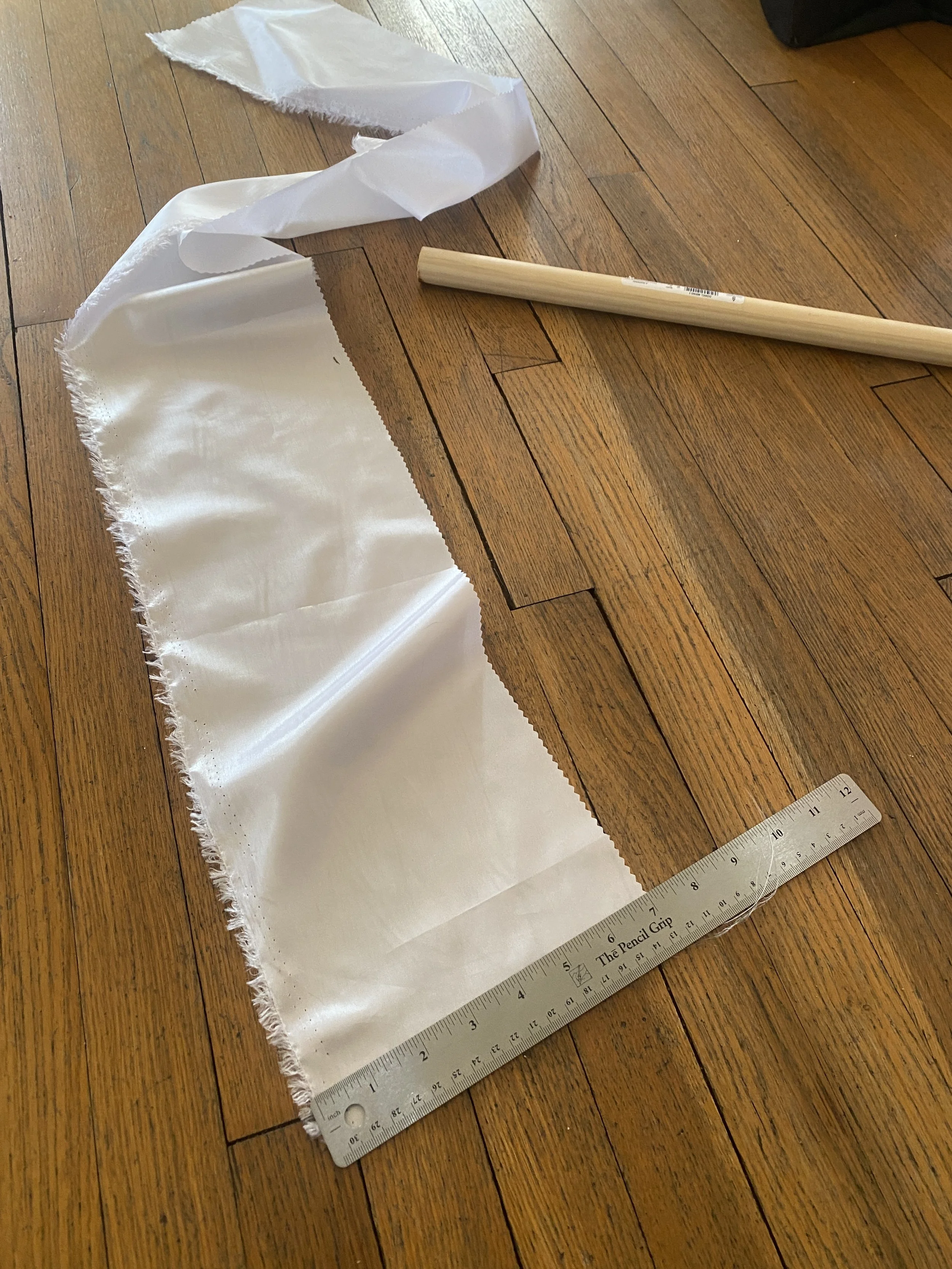 I wondered if perhaps I should paint the dowels black, thinking they might be easier to see if our dancers needed to toss their scarves into the air and then catch them. Since it’s too cold to be applying paint outside, I made a tube of art paper…