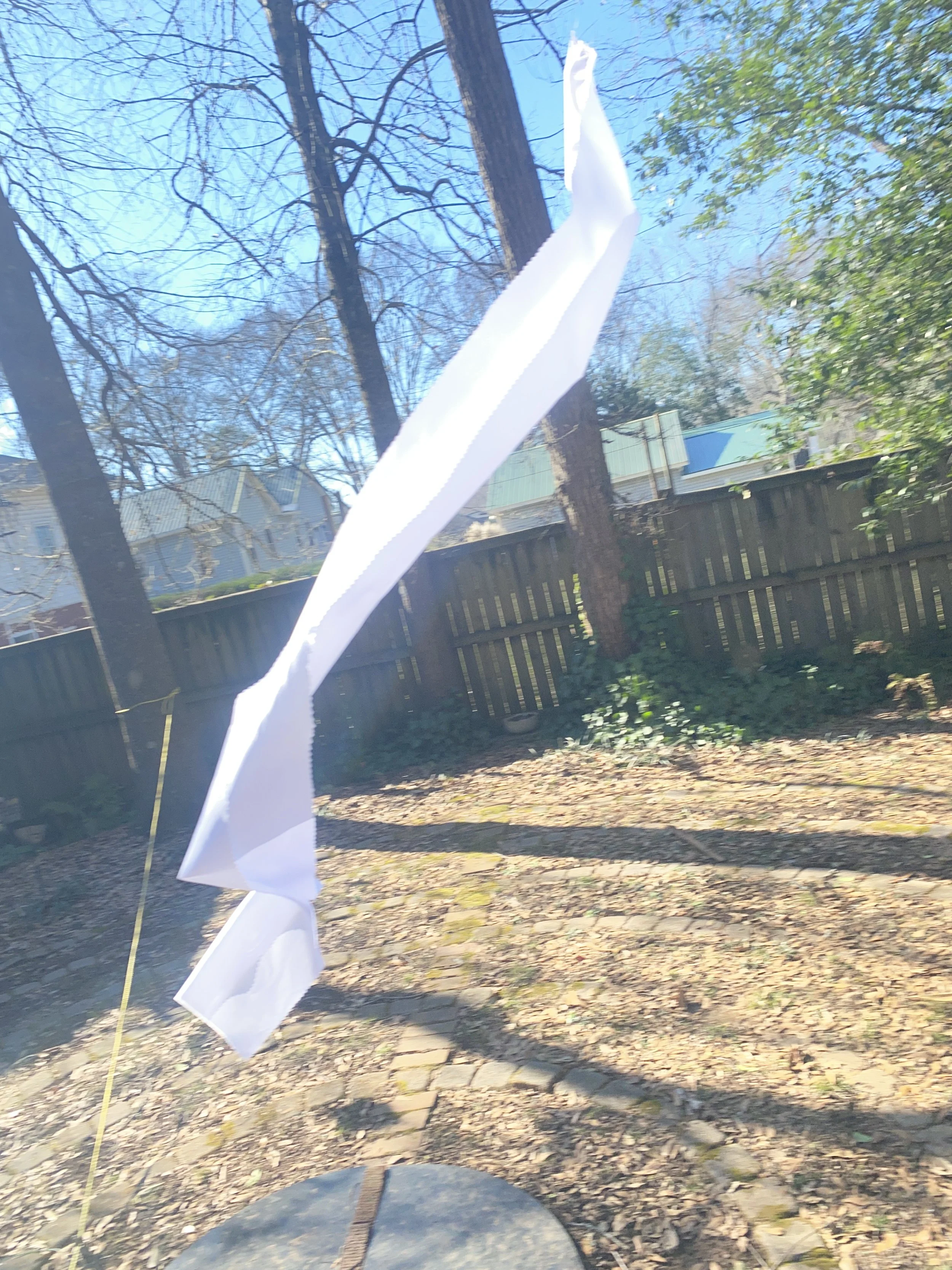 After sewing the handle into its tube, I took my ABORTIVE ATTEMPT out to the labyrinth to play with it. I tried to get a photo of it when I tossed it into the air, but that’s kind of hard to do with only two hands.